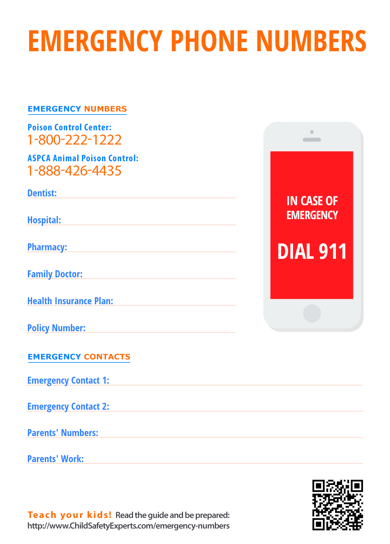 Print and fill out this list of useful phone numbers and put it on the fridge. Make sure your child and the babysitter knows where it is.